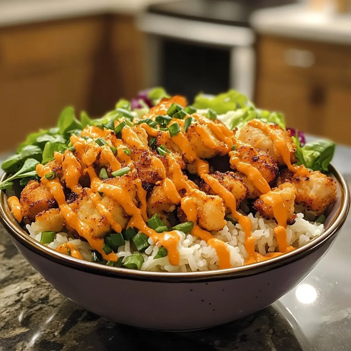 - Assemble Bowls: Start with a generous scoop of warm jasmine rice in each bowl. Top with your crispy chicken, then layer on the shredded lettuce, diced cucumber, shredded carrots, and chopped green onions for a pop of color and freshness.