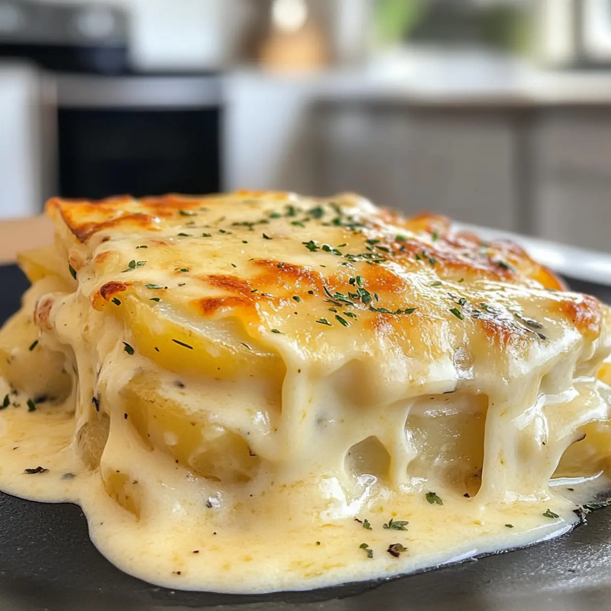 Layered Happiness: Each forkful reveals tender potatoes enveloped in a rich, creamy cheese sauce, bringing a smile to every family member.