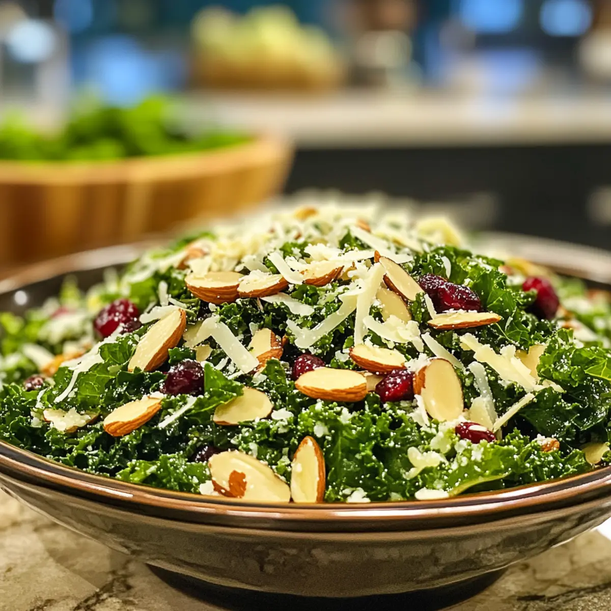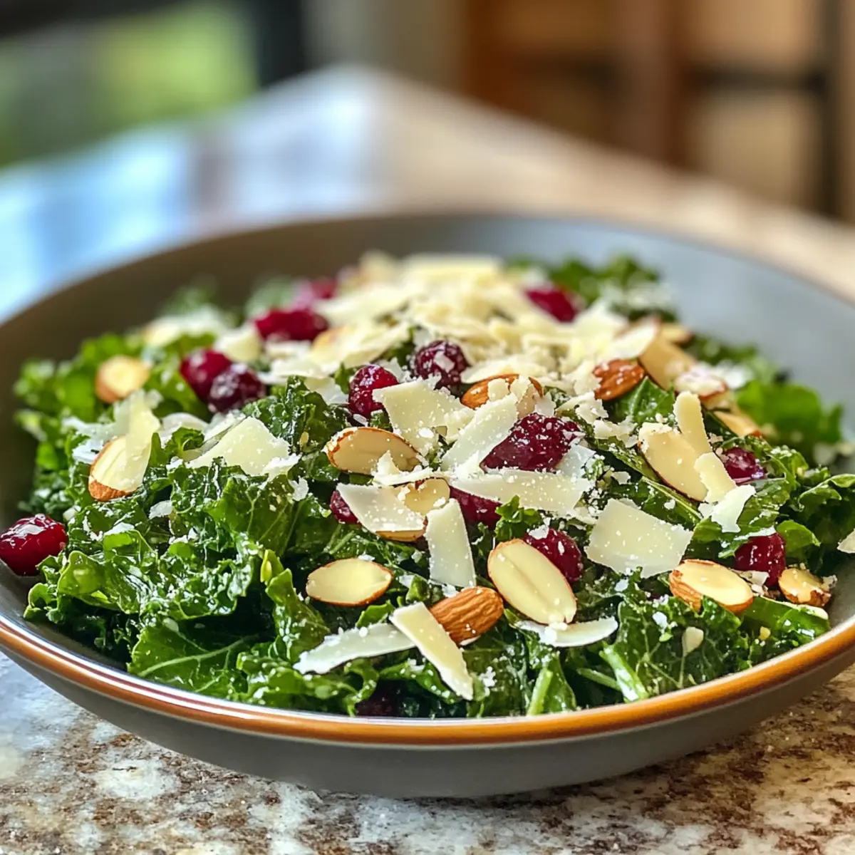 • Get ready for fresh, vibrant flavors with this Crisp Simple Kale Salad with Parmesan, Almonds, and Cranberries!