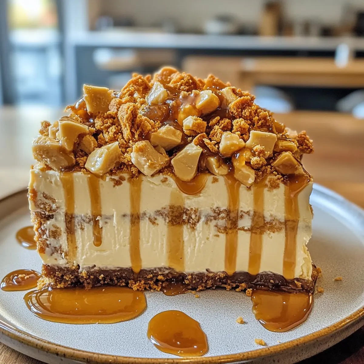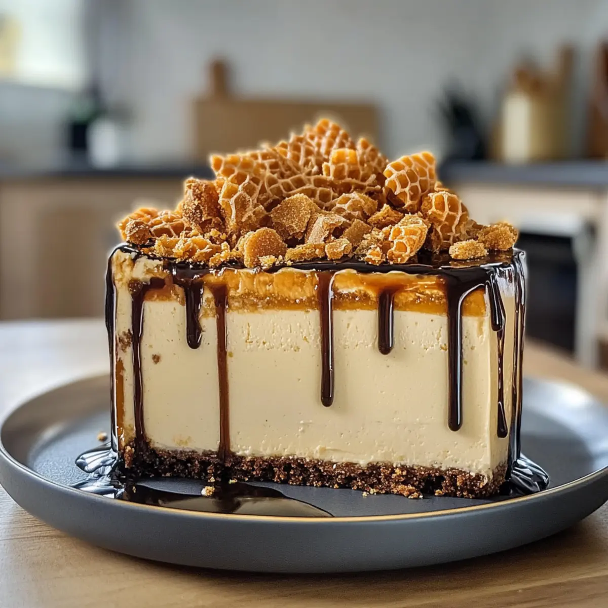 Indulgence awaits! This dessert beautifully marries the richness of cheesecake with the playful crunch of honeycomb.