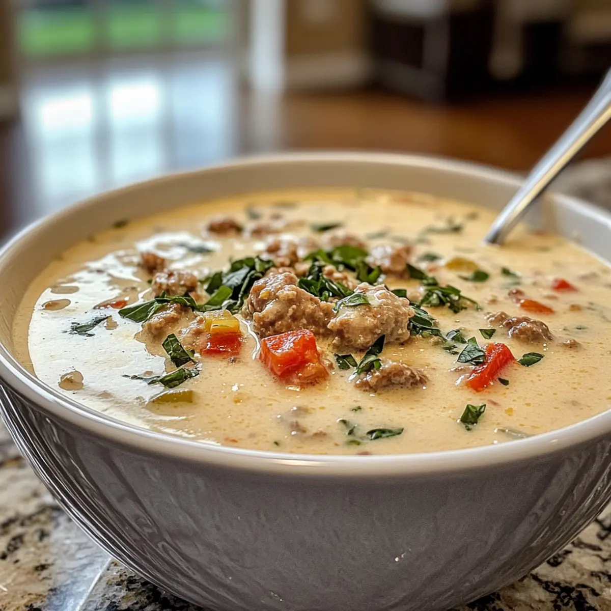 Enjoy this Delicious Creamy Parmesan Italian Sausage Soup, a comforting bowl of warmth, quick to prepare and bursting with flavor.