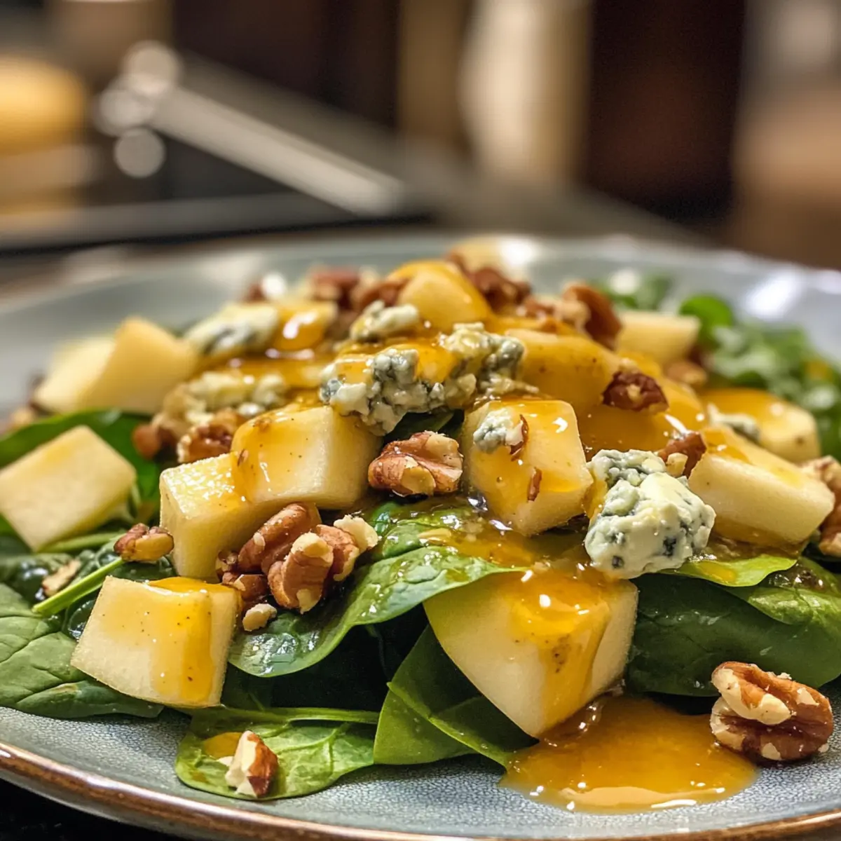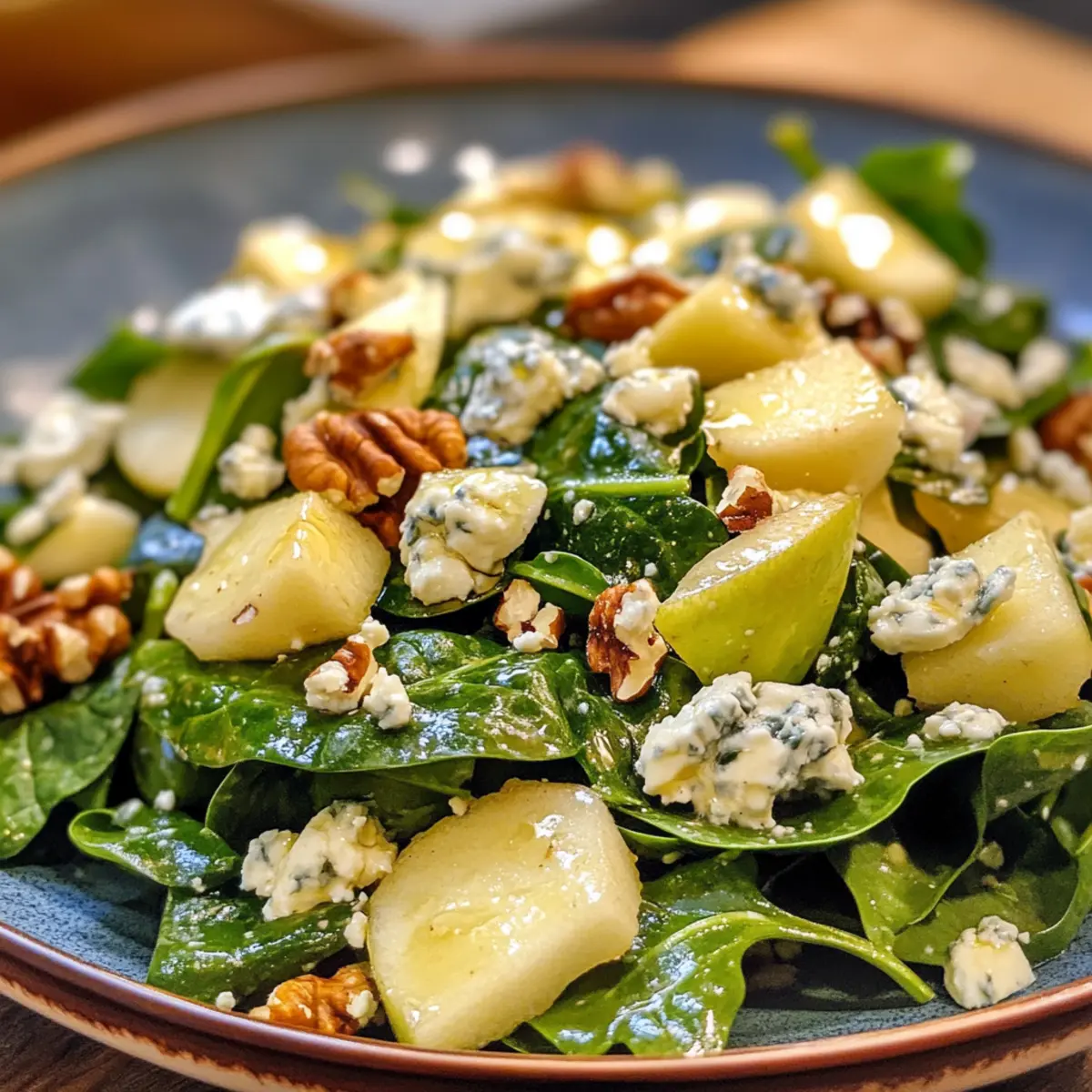 A vibrant and flavorful winter salad featuring spinach, honeycrisp apples, gorgonzola, and walnuts, perfect for festive gatherings.