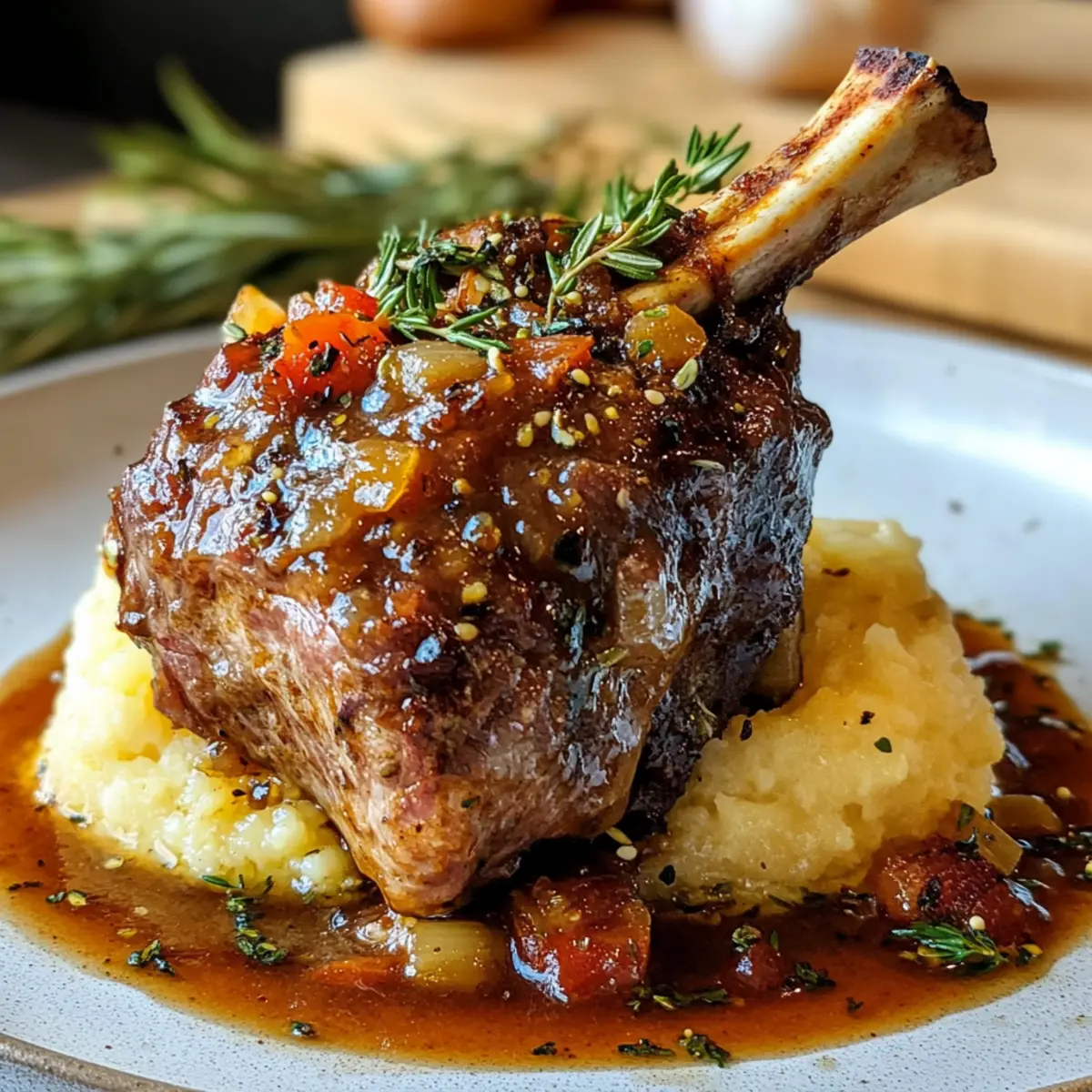 Serve: Plate the tender lamb over creamy mashed potatoes, drizzle the rich sauce generously on top, and garnish with fresh thyme. Pair with seasonal green vegetables for a complete and scrumptious meal.