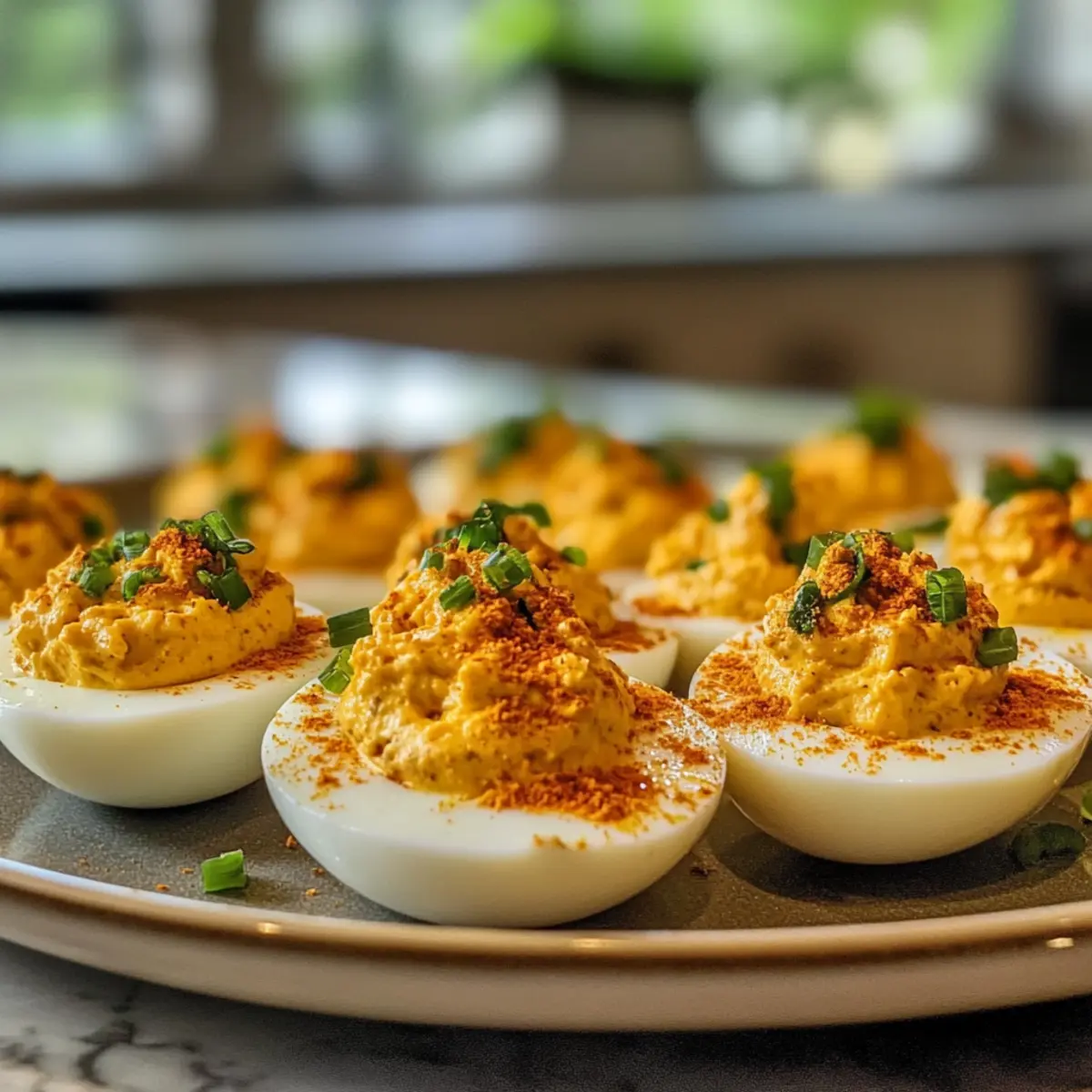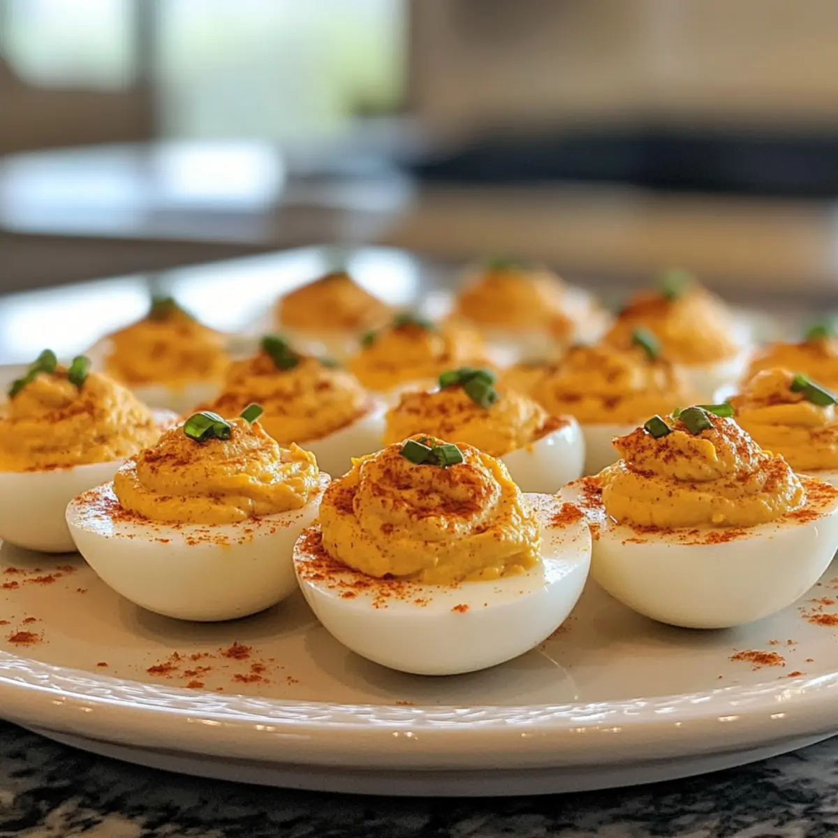 Final Touches: Insert chopped chives into the center of each egg to act as stems, and sprinkle a dash of smoked paprika on top for color and warmth.