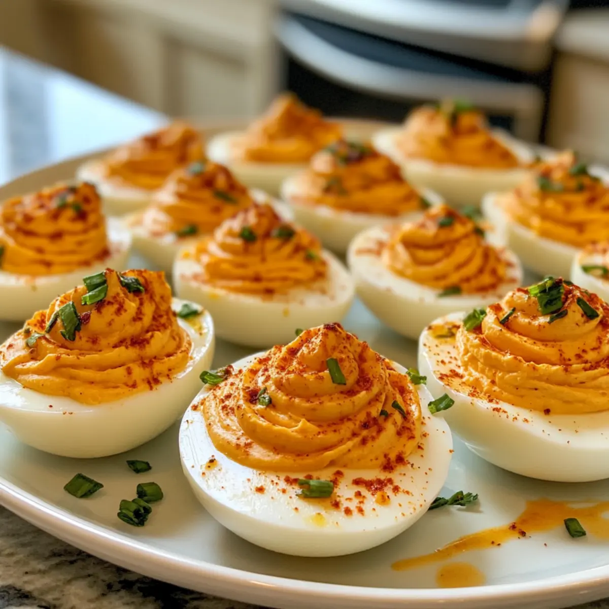 Absolutely! To make a vegan version, substitute the mayonnaise with vegan mayo or use mashed avocado for creaminess. Ensure your hard-boiled eggs are replaced with a suitable egg substitute or avocado as the base. The result will still be a flavorful, eye-catching appetizer that everyone can enjoy!