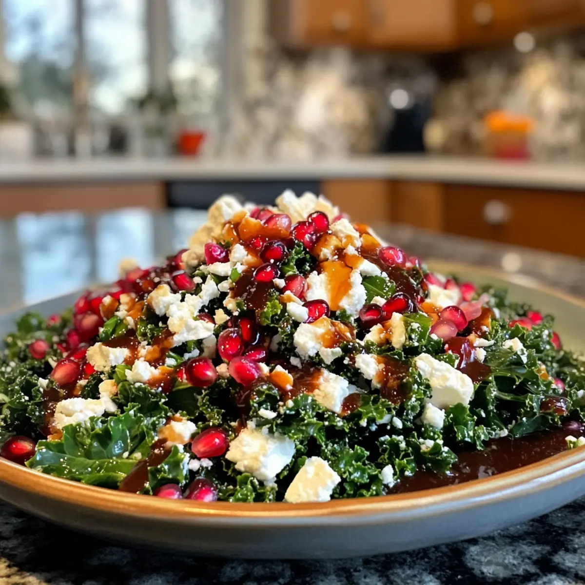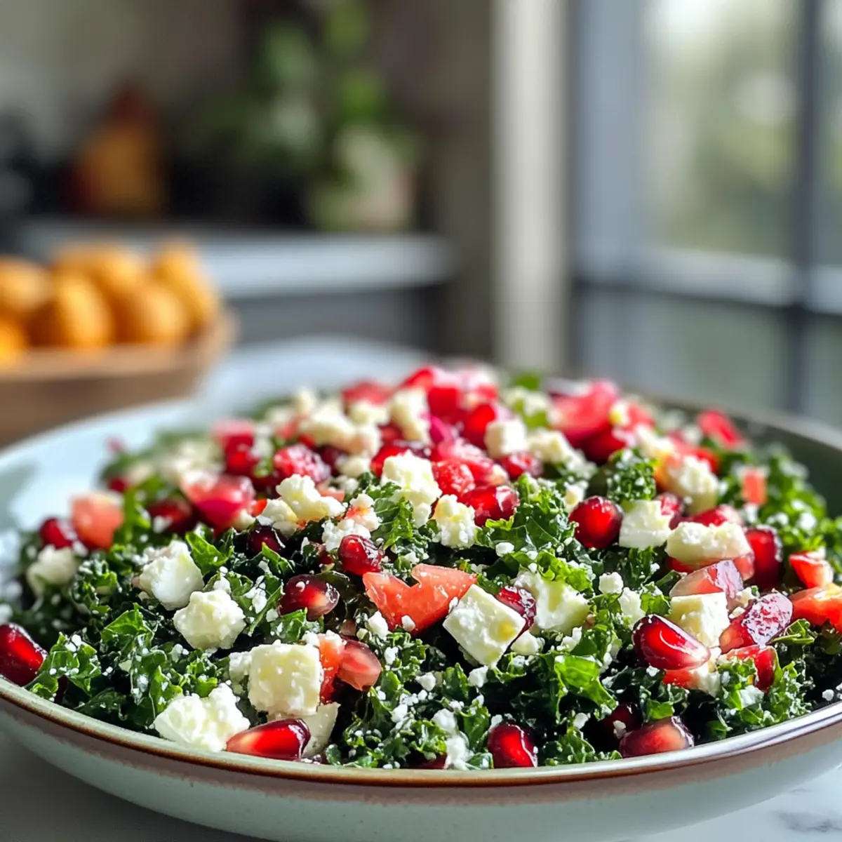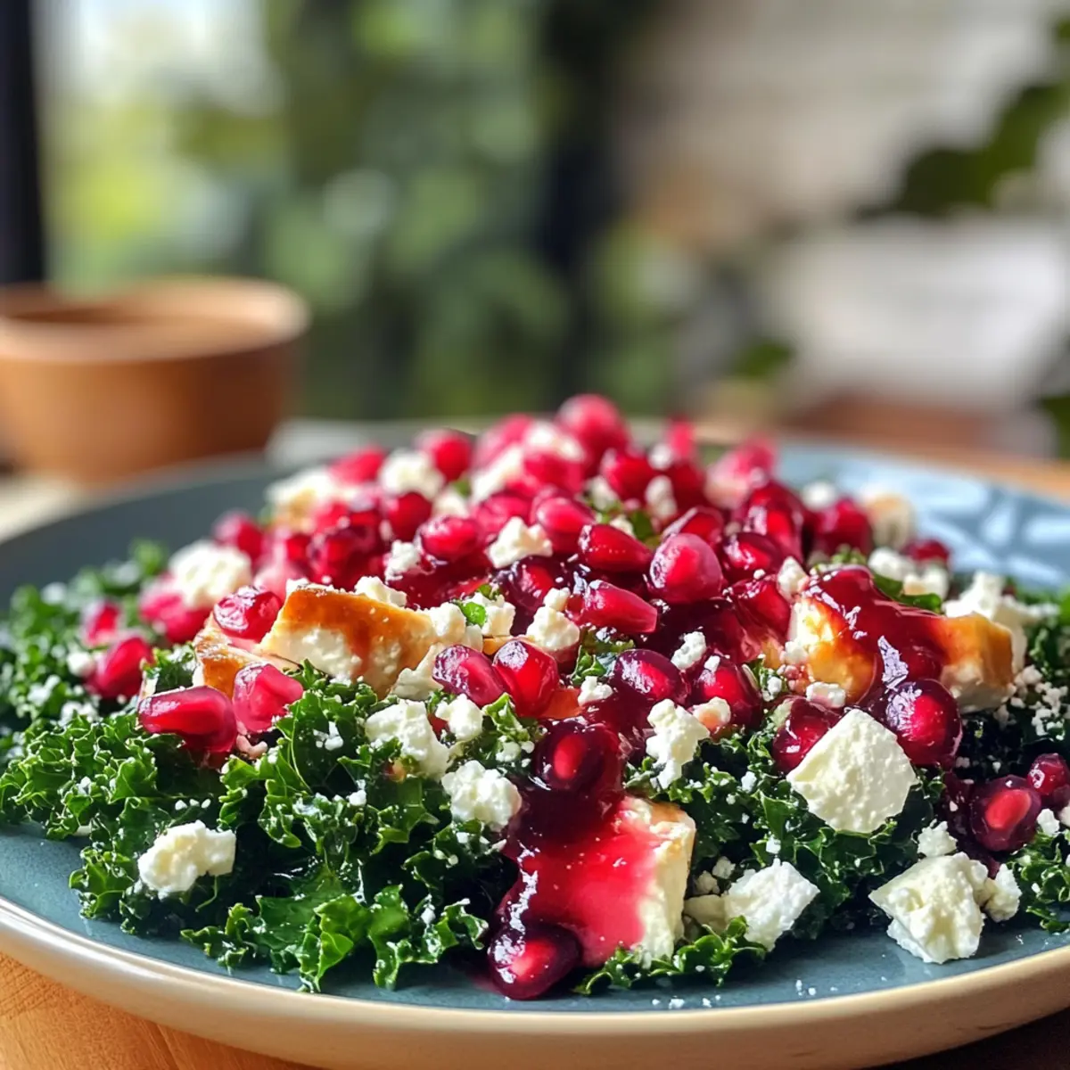 Colorful presentation: A feast for the eyes, this salad bursts with vibrant hues from fresh kale and rich pomegranate seeds.